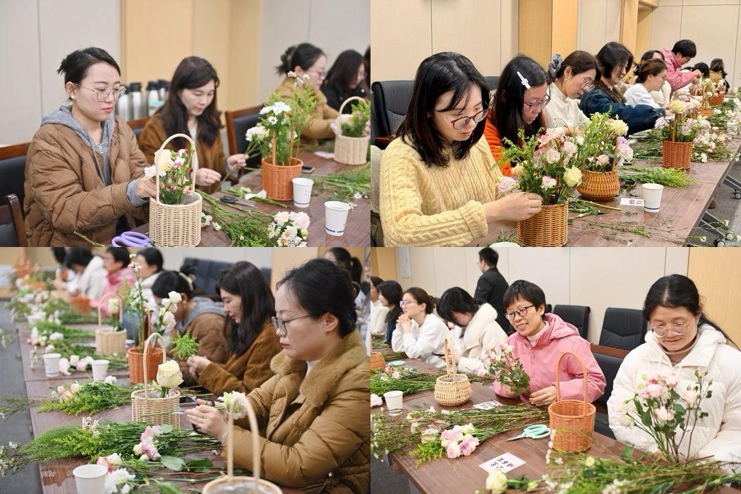 活动邀请了校医院金巾医生带来女性健康知识讲座,她围绕骨骼健康等方面展开讲述,引导大家树立正确健康理念。园艺学院博士研究生刘丽颖带来插花艺术培训,她从花材选择、色彩搭配、造型设计等方面细致讲解,让大家感受到插花艺术的美学魅力。在插花体验环节,女教师们发挥创意,修剪花枝、搭配造型,亲手制作出各具特色的花艺作品,现场花香四溢、笑语盈盈,大家互相交流心得、合影留念。