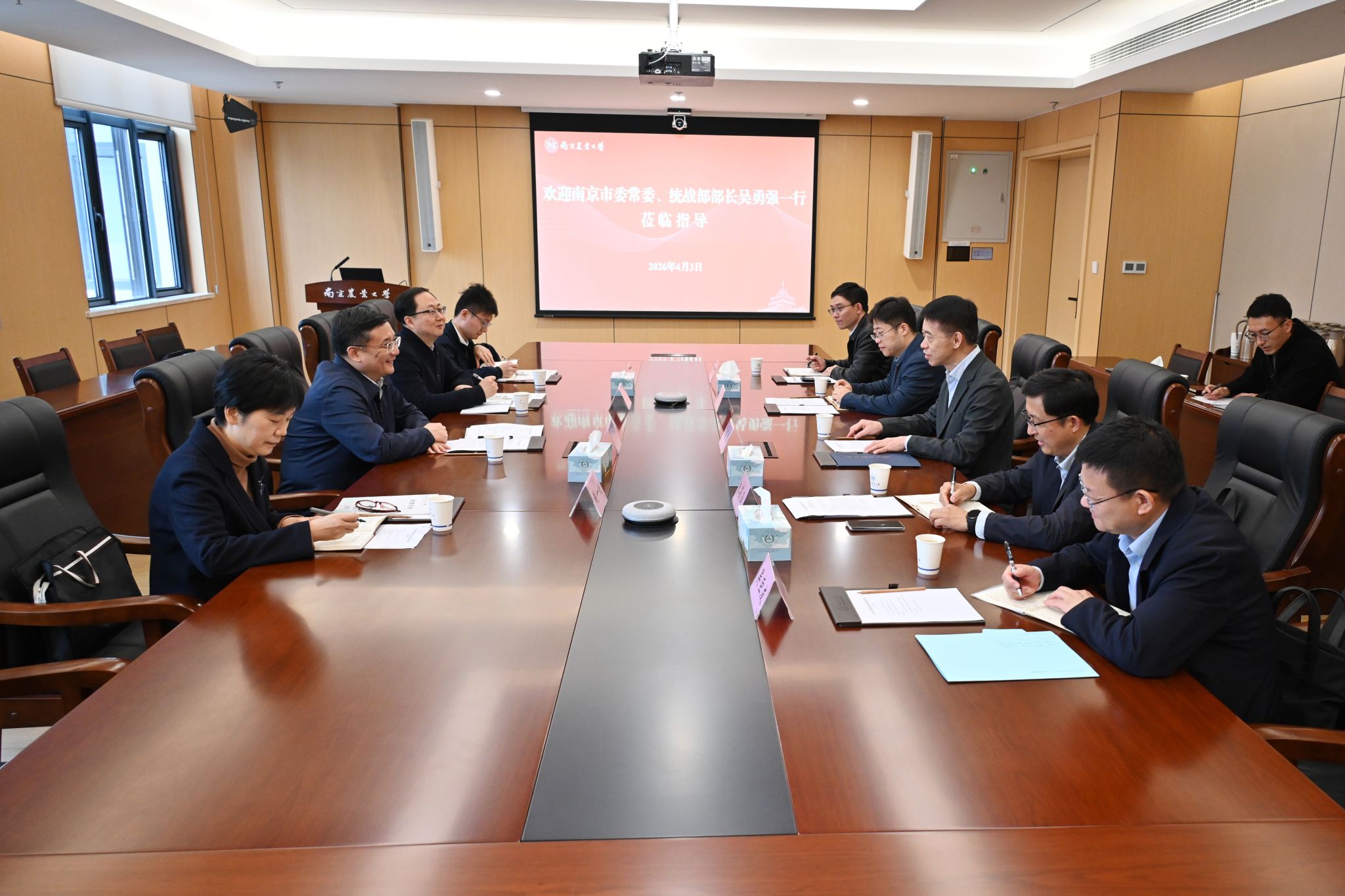4月3日,南京市委常委、统战部部长吴勇强一行来校调研。校党委书记王春春陪同调研并主持座谈会。